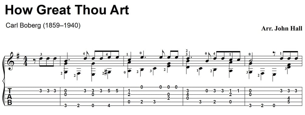 My arrangements of six classic hymns for solo guitar: Amazing Grace, Now All the Vault of Heaven Resounds, The Old Rugged Cross, How Great Thou Art, In the Garden and Just a Closer Walk With Thee. High intermediate level of difficulty. Standard notation with fingering and tab included.
